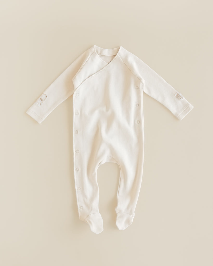 Kimono footie in the softest organic pima cotton. Patch details at sleeve. Transition from sleep to play in this pima favorite! Kimono style for easy dressing. Matches back to the Dove white Iona poppy bonnet.