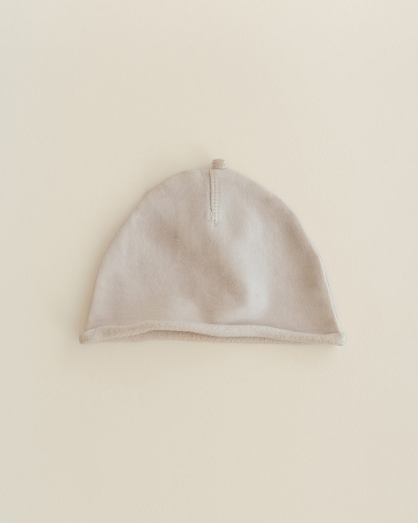 Beanie featuring a rolled edge and made in the softest organic cotton sweatshirt fabric. Matches back to the oat flap footie.